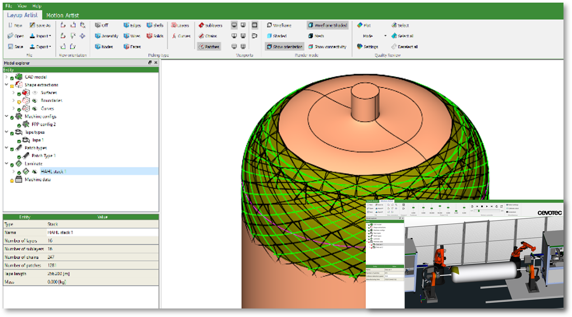 Der Münchner Automations-Spezialist Cevotec ermöglicht es Herstellern, komplexe Faserverbund-Bauteile in hoher Stückzahl und Qualität zu fertigen. Mit den auf Fiber Patch Placement basierenden SAMBA Systemen bietet Cevotec individuell konfigurierbare, vollautomatische Faser-Layup-Systeme mit integrierter Prozesskontrolle für die Herstellung komplexer 3D-Geometrien und Multimaterial-Laminate an. ARTIST STUDIO ist die technologiespezifische CAD-CAM Software zur Laminaterstellung und automatisierten Roboterprogrammierung.