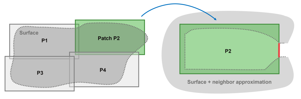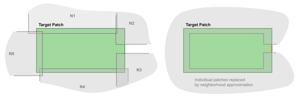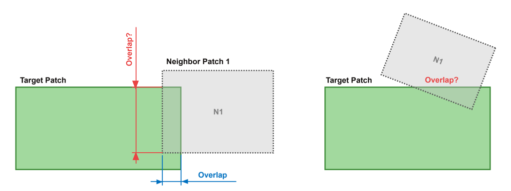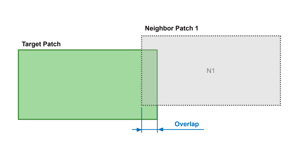 The central image above illustrates the merged overlap boundary of all neighboring patches around the green target patch. The dotted polyline represents the combined boundaries, while the gray area indicates the part of the target patch that is effectively overlapped by neighboring patches. Because this polyline can form highly irregular shapes, a direct overlap measurement is not feasible.