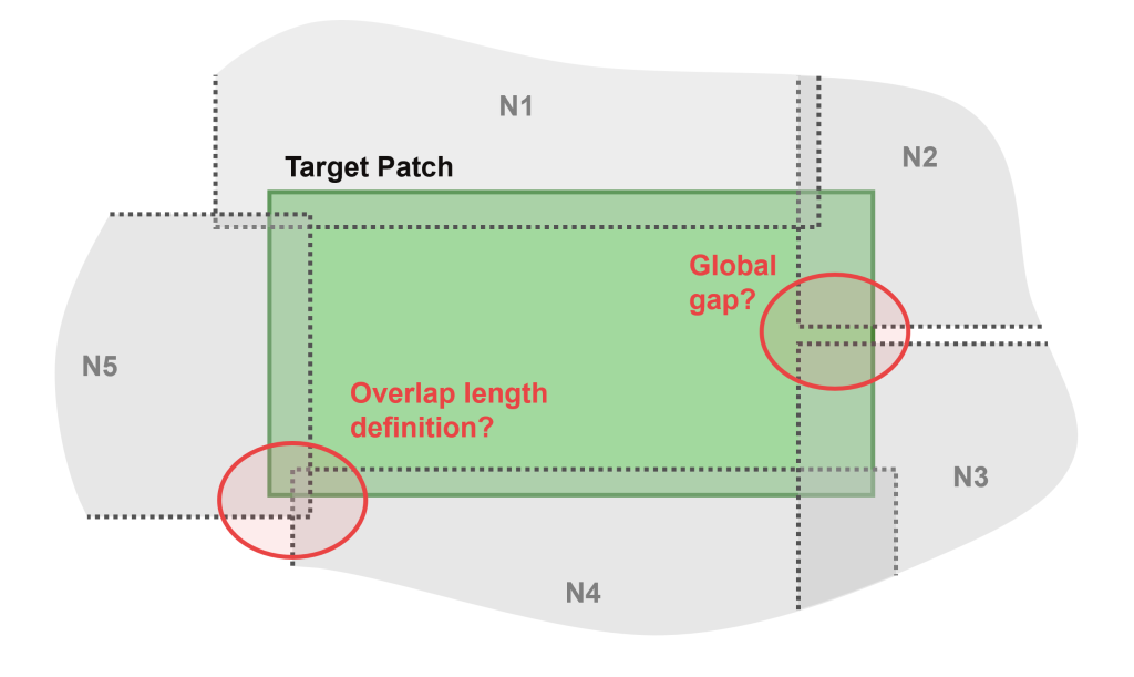 These limitations prompted our software team to question whether edge-to-edge distance measurements truly address the underlying problem. The core challenge becomes clear in the next example: multiple neighboring patches (N1–N5) overlap a central target patch. None of the neighbors fully overlaps one of the target patch’s edges – a situation that is very typical, especially when working with patches of constant shape. Additionally, a global gap becomes visible. Based on the previously described edge-to-edge definition, how would it be possible to ensure that the target patch is sufficiently overlapped on all sides?