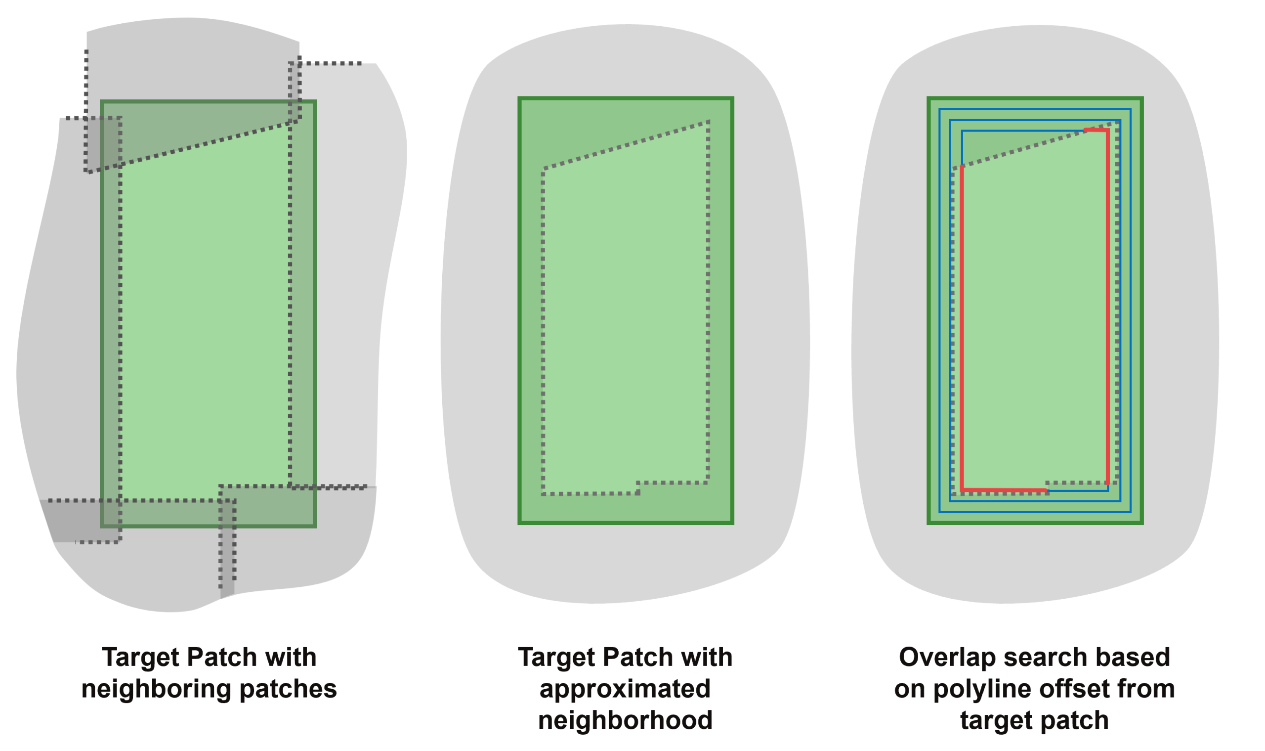Instead, as shown in the rightmost image, the shape of the target patch is offset inward in multiple steps. For each increment, the system checks whether the currently offset target patch polyline intersects the neighborhood polyline. As soon as an intersection is detected, the algorithm has identified the minimum overlap distance for that specific patch.