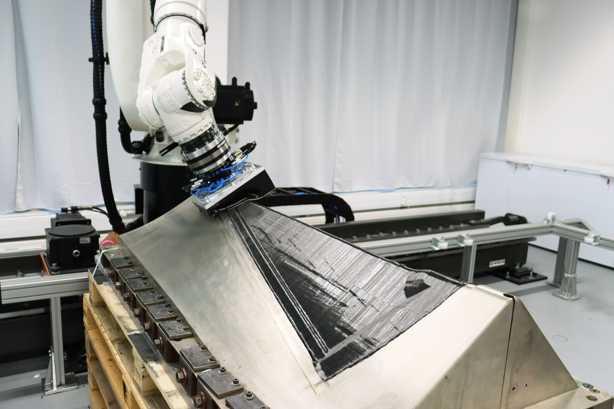 A key goal of the grant-supported project ACoSaLUS was to further optimize the Fiber Patch Placement process in order to implement an end-to-end automated lay-up process for composite sandwich parts. Dealing with the challenge of placing larger patches on a strongly curved legacy tooling, we advanced the Rolling Motion placement feature to consider multiple angles of compaction in one movement. In order to further increase adhesion and overcome bridging effects at the trimming edges of the tool, our robots and grippers can now also perform post-placement push-ins, emulating typical manual lay-up activities.